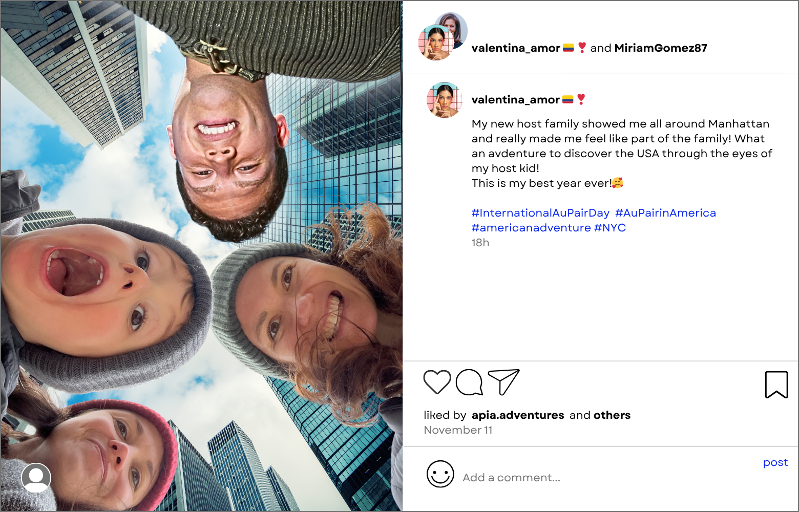- The post must use both hashtags #InternationalAuPairDay and #AuPairinAmerica, and you must also follow @apia.adventures.